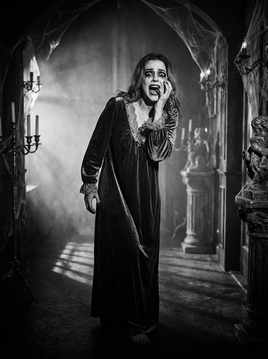 black and white 35mm film of model as a 1920s silent horror film scream queen, wearing a flowing nightgown, dramatically terrified expression with hand to face , harsh shadows, high-contrast black and white, gothic mansion set with fog effects