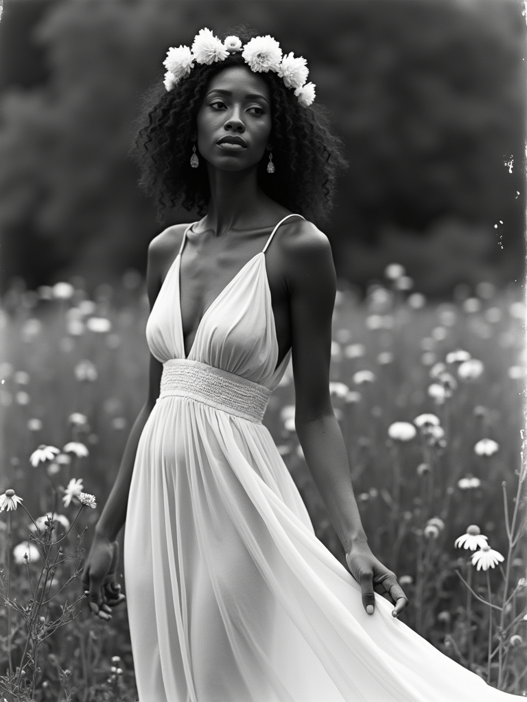 black and white 35mm film of model as a romantic lead in a silent film, wearing a flowing white dress with flower crown, dreamy expression looking off-camera , soft focus effect, black and white with vintage film scratches, garden setting with flowers