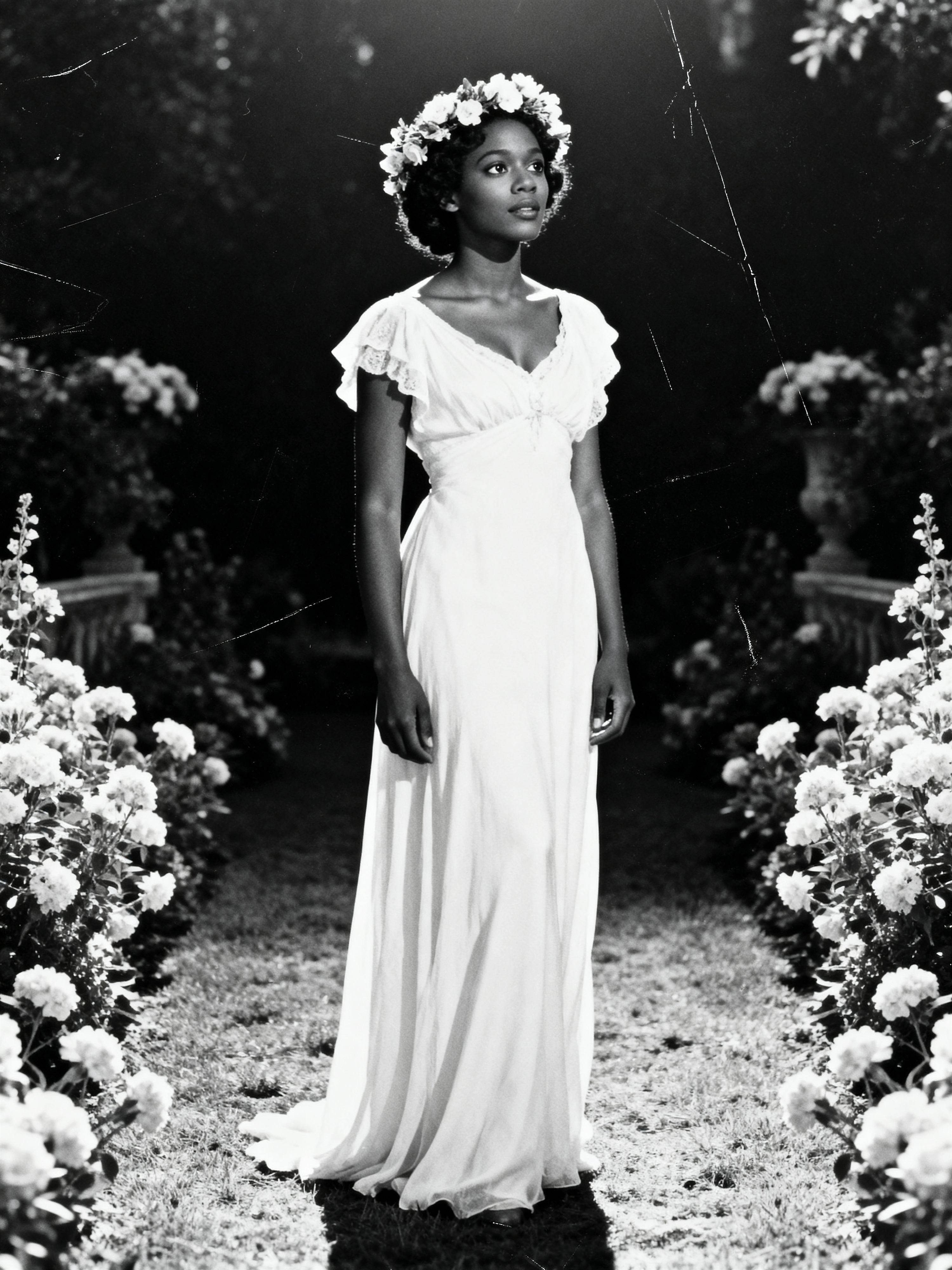 black and white 35mm film of model as a romantic lead in a silent film, wearing a flowing white dress with flower crown, dreamy expression looking off-camera , soft focus effect, black and white with vintage film scratches, garden setting with flowers