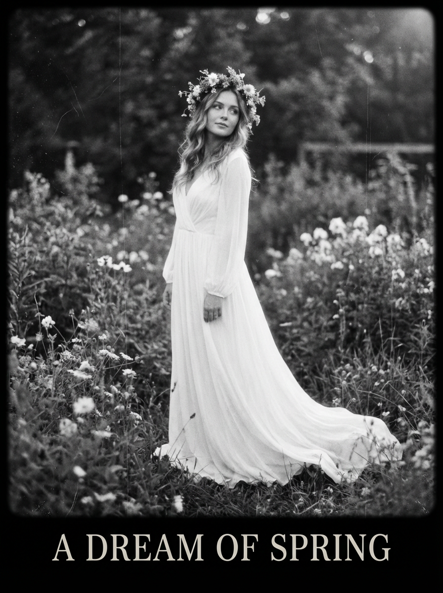 black and white 35mm film of model as a romantic lead in a silent film, wearing a flowing white dress with flower crown, dreamy expression looking off-camera , soft focus effect, black and white with vintage film scratches, garden setting with flowers
