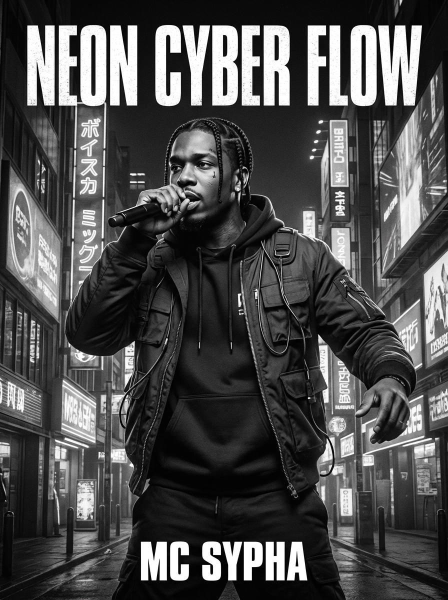 black and white album cover, full body photo of model in neon-lit 1990s rap album aesthetic, cyberpunk background. Glowing city lights, rap performance stance. Sci-fi hip-hop crossover.