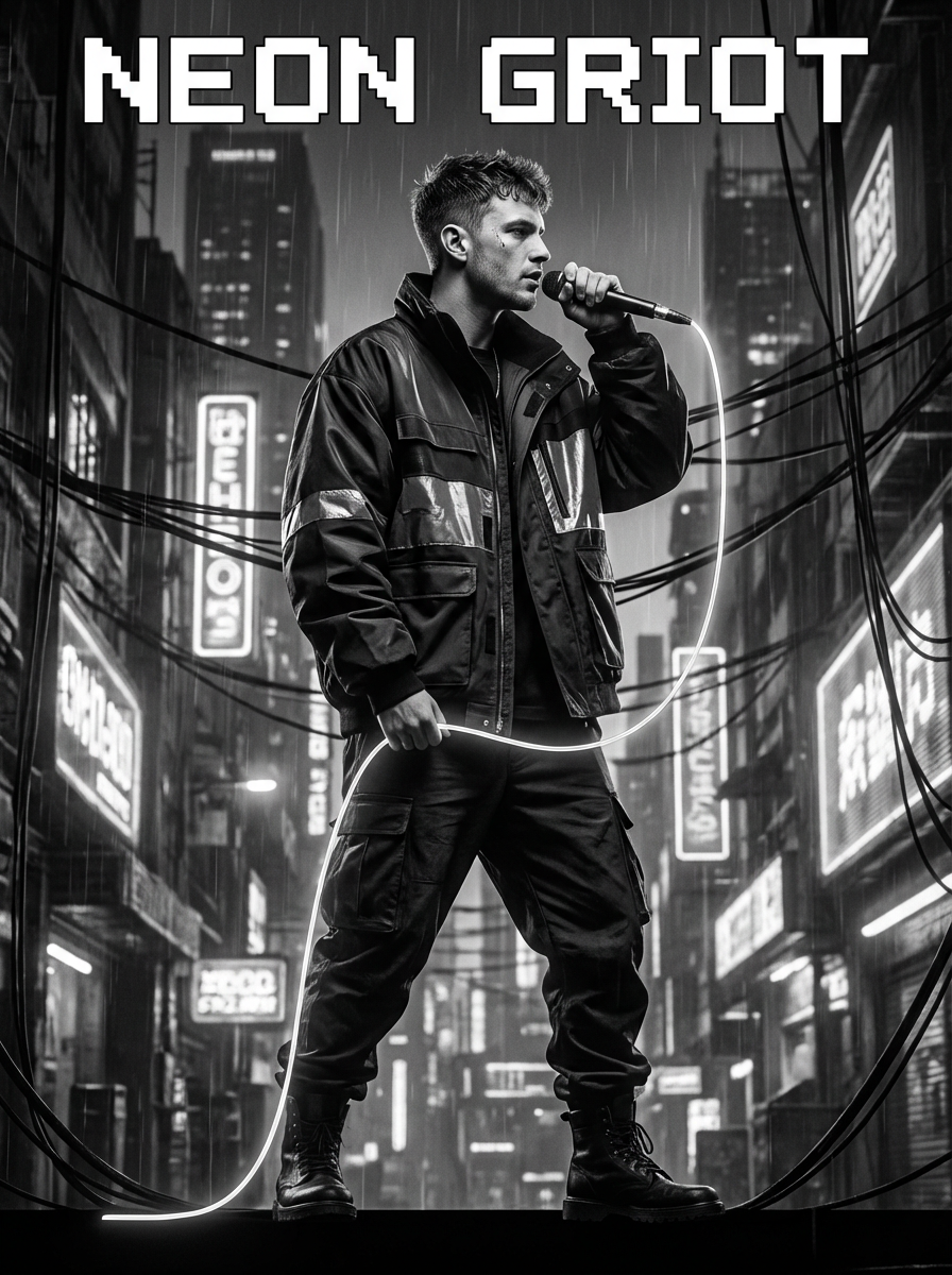 black and white album cover, full body photo of model in neon-lit 1990s rap album aesthetic, cyberpunk background. Glowing city lights, rap performance stance. Sci-fi hip-hop crossover.