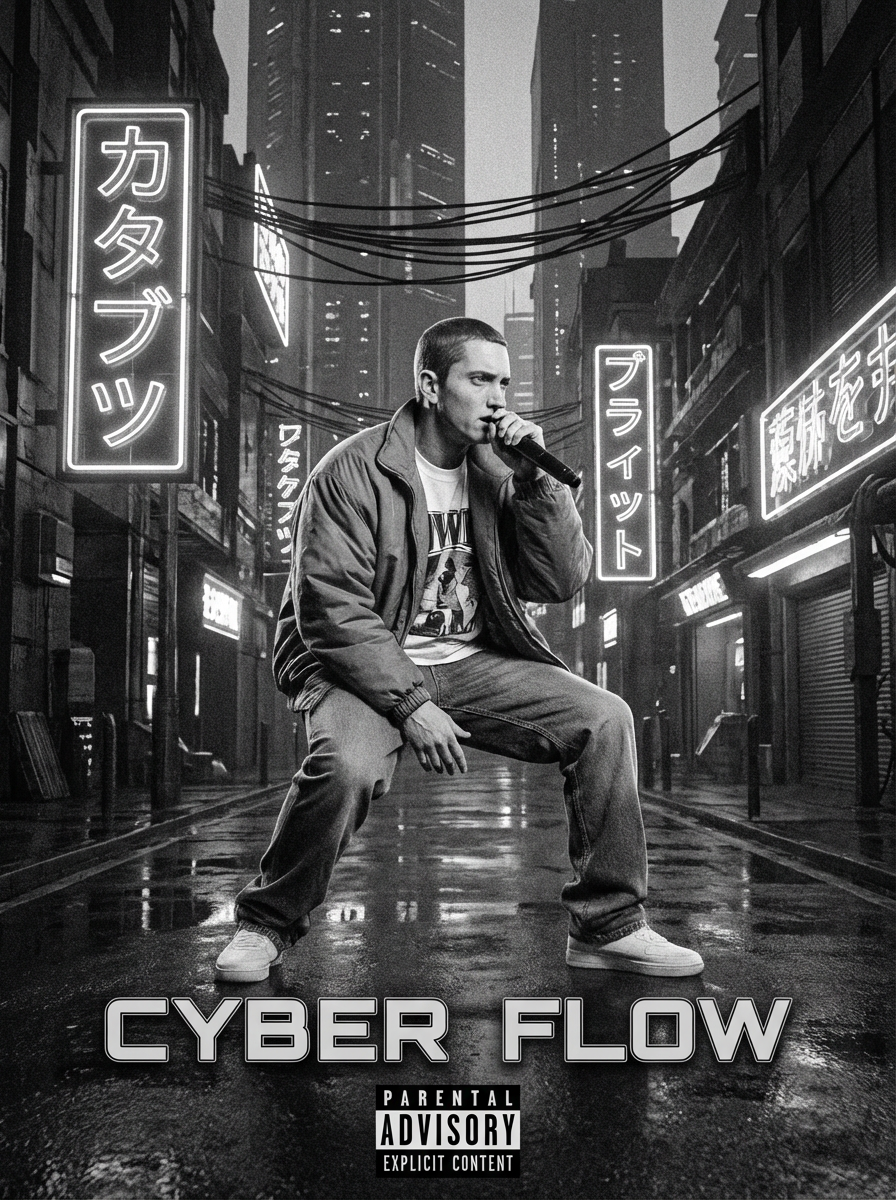 black and white album cover, full body photo of model in neon-lit 1990s rap album aesthetic, cyberpunk background. Glowing city lights, rap performance stance. Sci-fi hip-hop crossover.