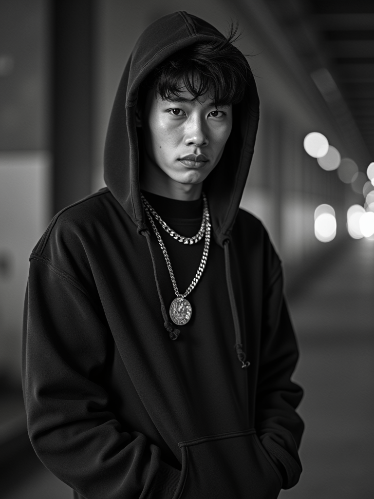 black and white album cover, full body photo of Model posing for a 1990s rap album cover. Wearing a hoodie, gold grill, flexing jewelry. Dark moody lighting, urban backdrop.
