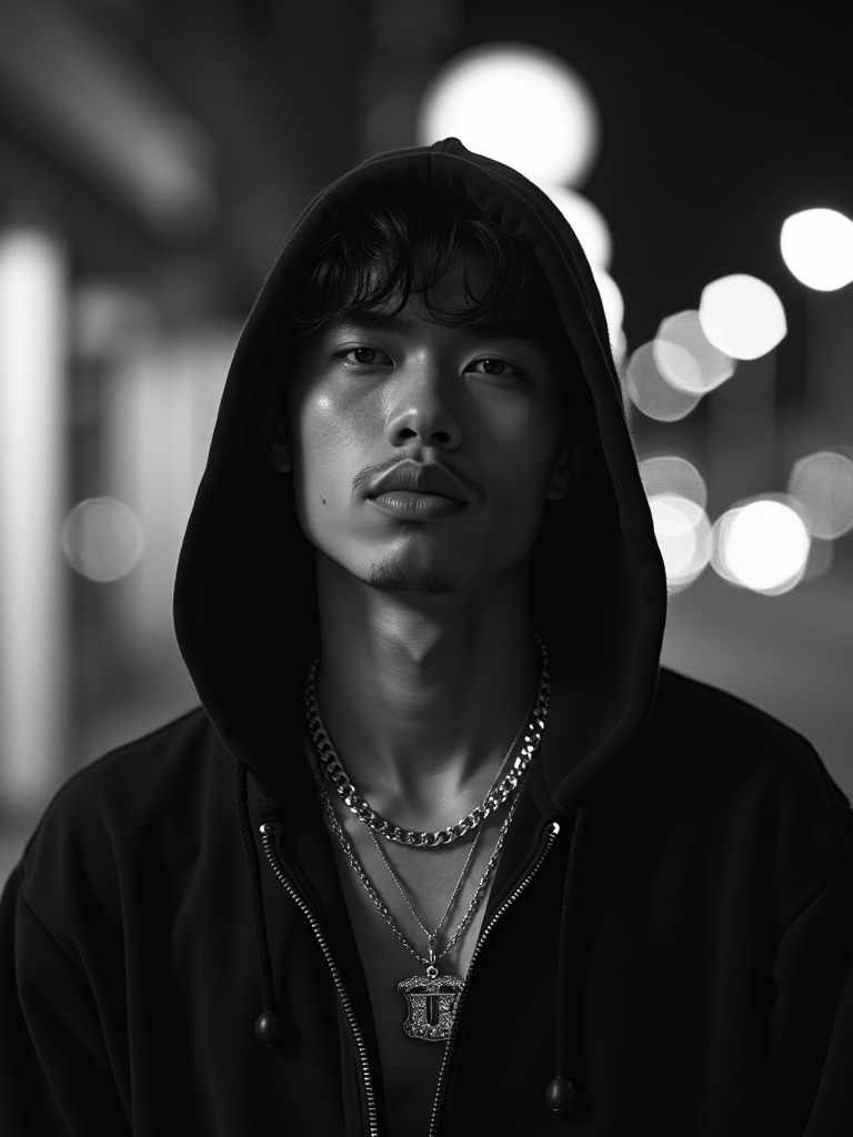 black and white album cover, full body photo of Model posing for a 1990s rap album cover. Wearing a hoodie, gold grill, flexing jewelry. Dark moody lighting, urban backdrop.