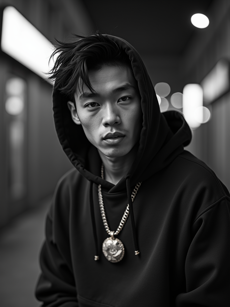 black and white album cover, full body photo of Model posing for a 1990s rap album cover. Wearing a hoodie, gold grill, flexing jewelry. Dark moody lighting, urban backdrop.