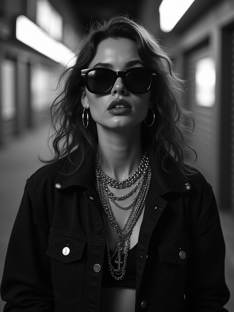 black and white album cover, full body photo of Model posing for a 1990s rap album cover. Wearing oversized sunglasses, gold chains, streetwear jacket . Dark moody lighting, urban backdrop.
