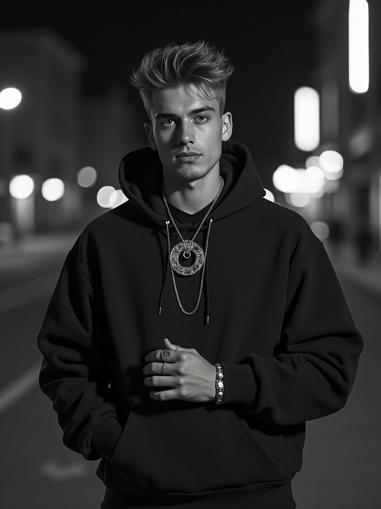 black and white album cover, full body photo of Model posing for a 1990s rap album cover. Wearing a hoodie, gold grill, flexing jewelry. Dark moody lighting, urban backdrop.