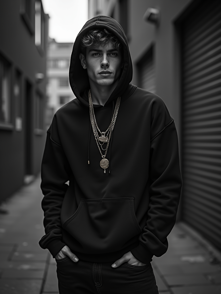 black and white album cover, full body photo of Model posing for a 1990s rap album cover. Wearing a hoodie, gold grill, flexing jewelry. Dark moody lighting, urban backdrop.