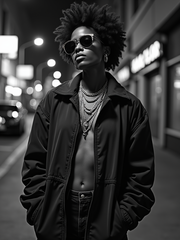 black and white album cover, full body photo of Model posing for a 1990s rap album cover. Wearing oversized sunglasses, gold chains, streetwear jacket . Dark moody lighting, urban backdrop.