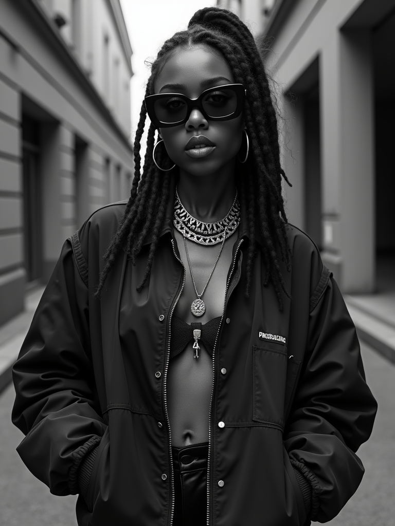 black and white album cover, full body photo of Model posing for a 1990s rap album cover. Wearing oversized sunglasses, gold chains, streetwear jacket . Dark moody lighting, urban backdrop.