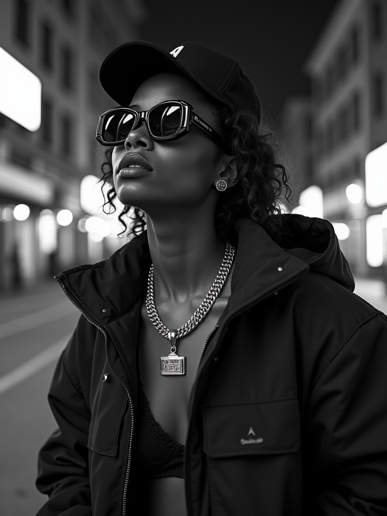 black and white album cover, full body photo of Model posing for a 1990s rap album cover. Wearing oversized sunglasses, gold chains, streetwear jacket . Dark moody lighting, urban backdrop.