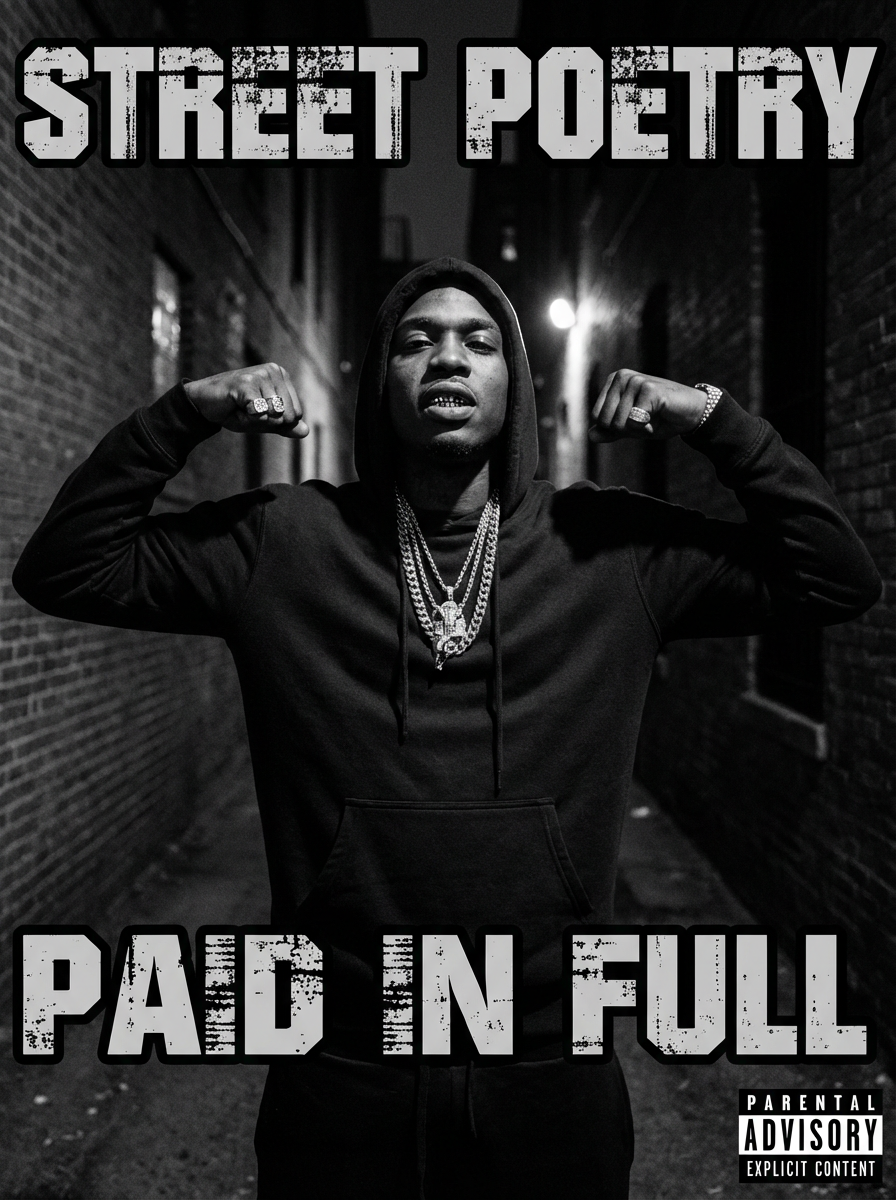 black and white album cover, full body photo of Model posing for a 1990s rap album cover. Wearing a hoodie, gold grill, flexing jewelry. Dark moody lighting, urban backdrop.