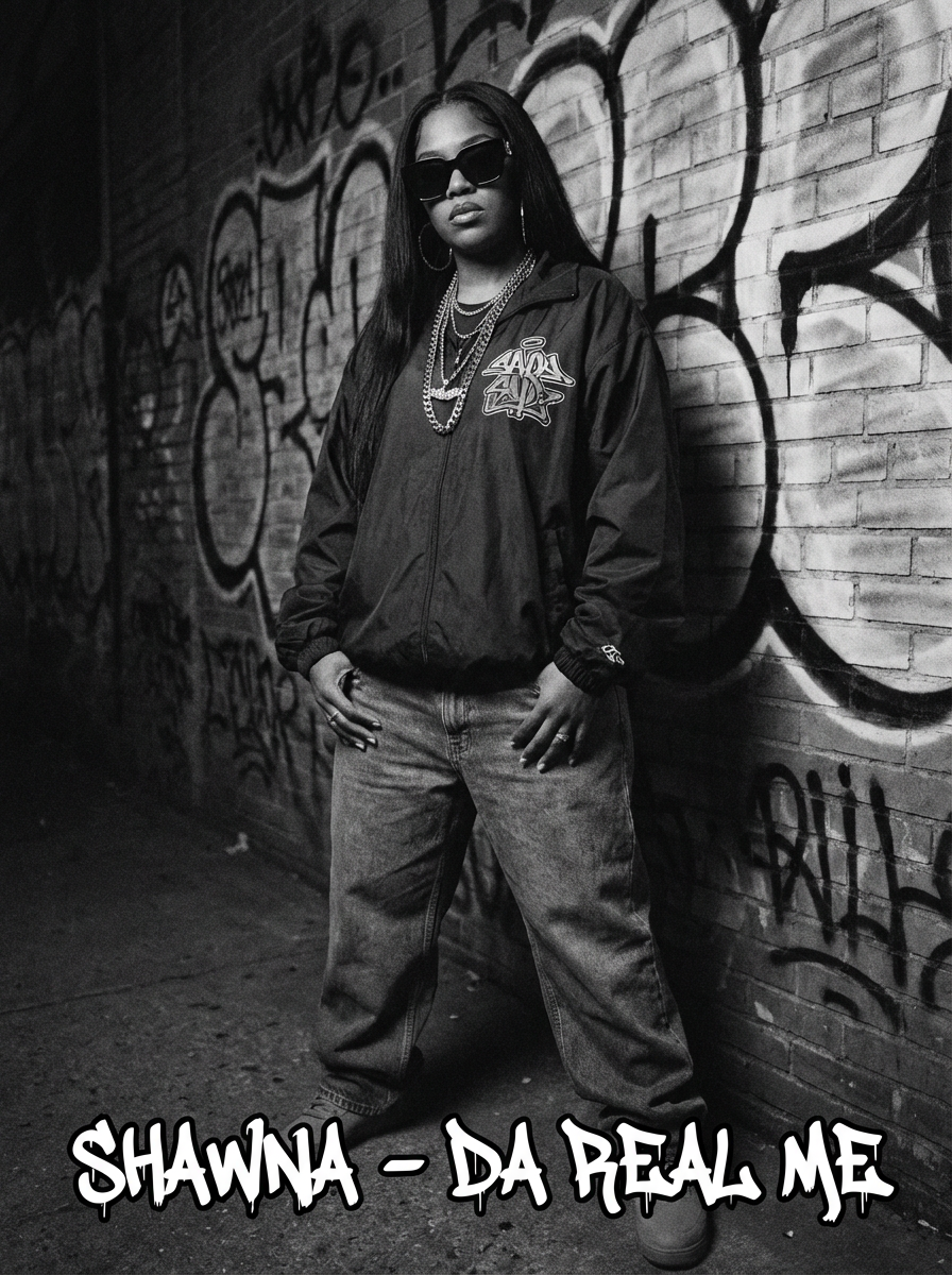 black and white album cover, full body photo of Model posing for a 1990s rap album cover. Wearing oversized sunglasses, gold chains, streetwear jacket . Dark moody lighting, urban backdrop.