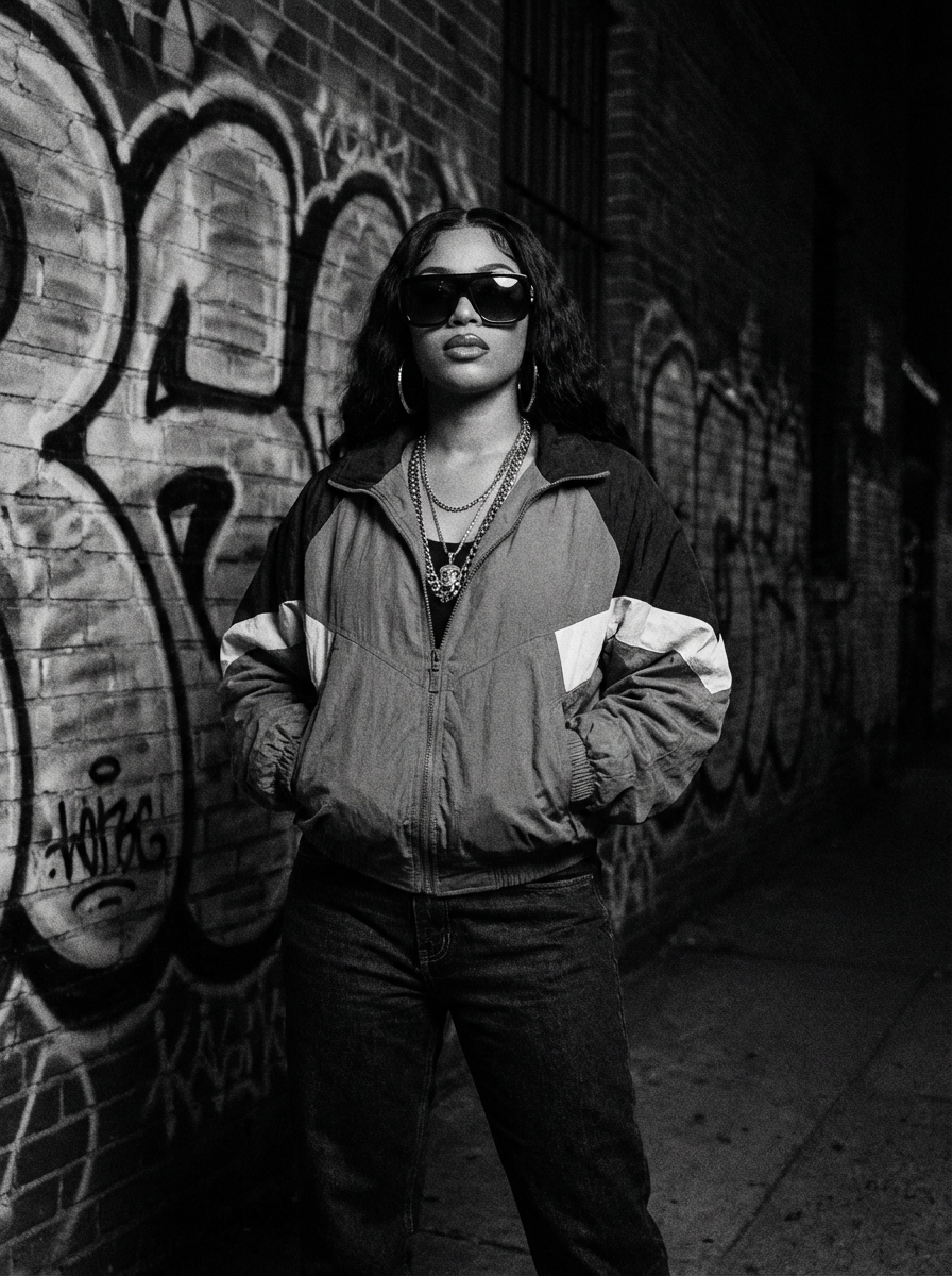 black and white album cover, full body photo of Model posing for a 1990s rap album cover. Wearing oversized sunglasses, gold chains, streetwear jacket . Dark moody lighting, urban backdrop.