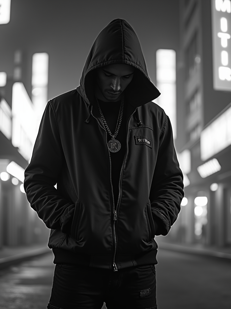 black and white album cover, full body photo of Neon-lit 1990s rap album aesthetic, cyberpunk background. Glowing city lights, rap performance stance. Sci-fi hip-hop crossover.