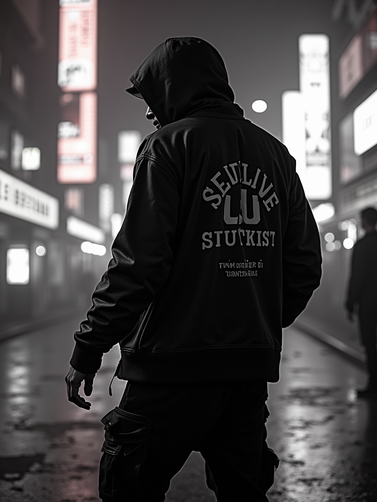black and white album cover, full body photo of Neon-lit 1990s rap album aesthetic, cyberpunk background. Glowing city lights, rap performance stance. Sci-fi hip-hop crossover.