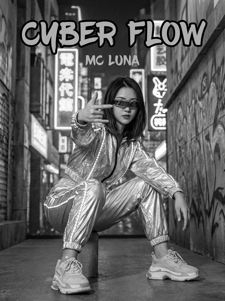 black and white album cover, full body photo of model in neon-lit 1990s rap album aesthetic, cyberpunk background. Wearing a futuristic tracksuit, striking rap pose . Sci-fi hip-hop crossover.