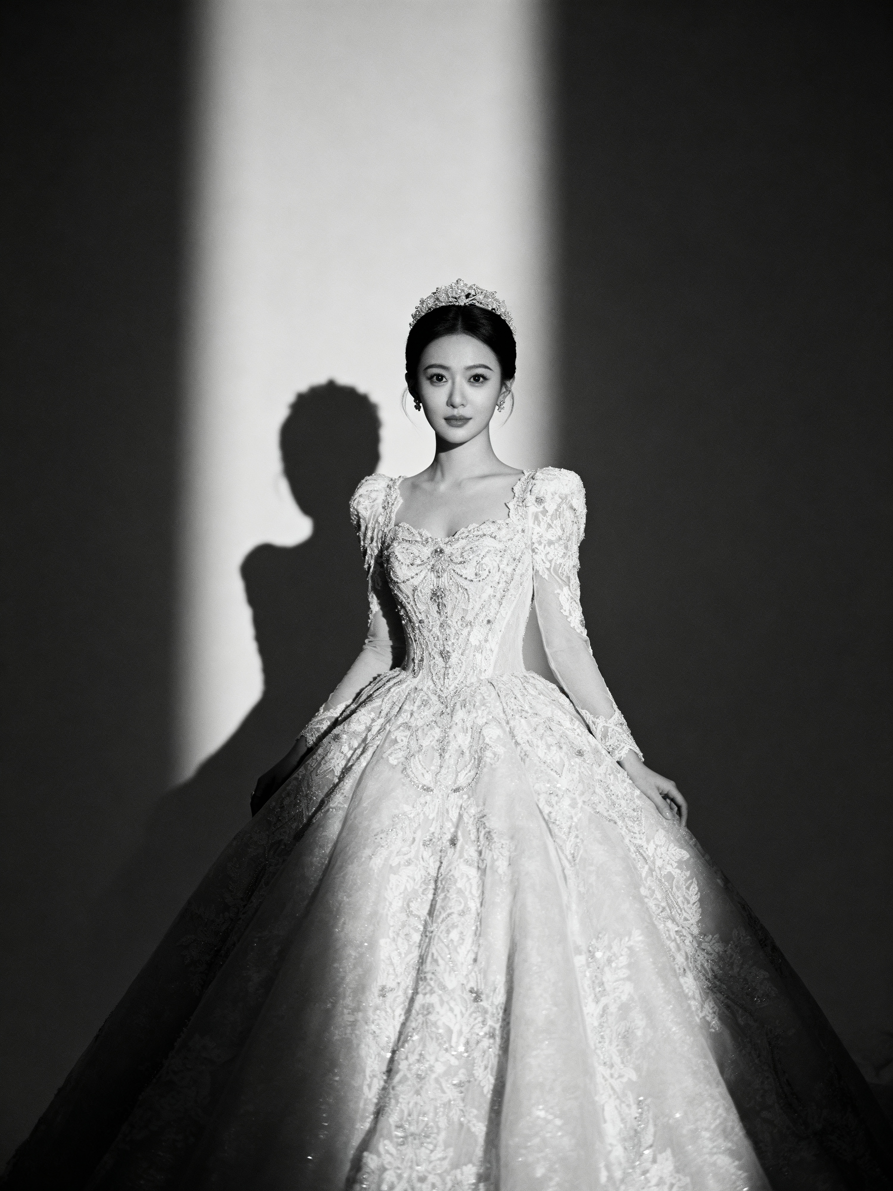 black and white Artistic wedding portrait, capturing emotions of the special day. Model wearing a vintage-inspired lace wedding dress . Timeless and graceful composition.