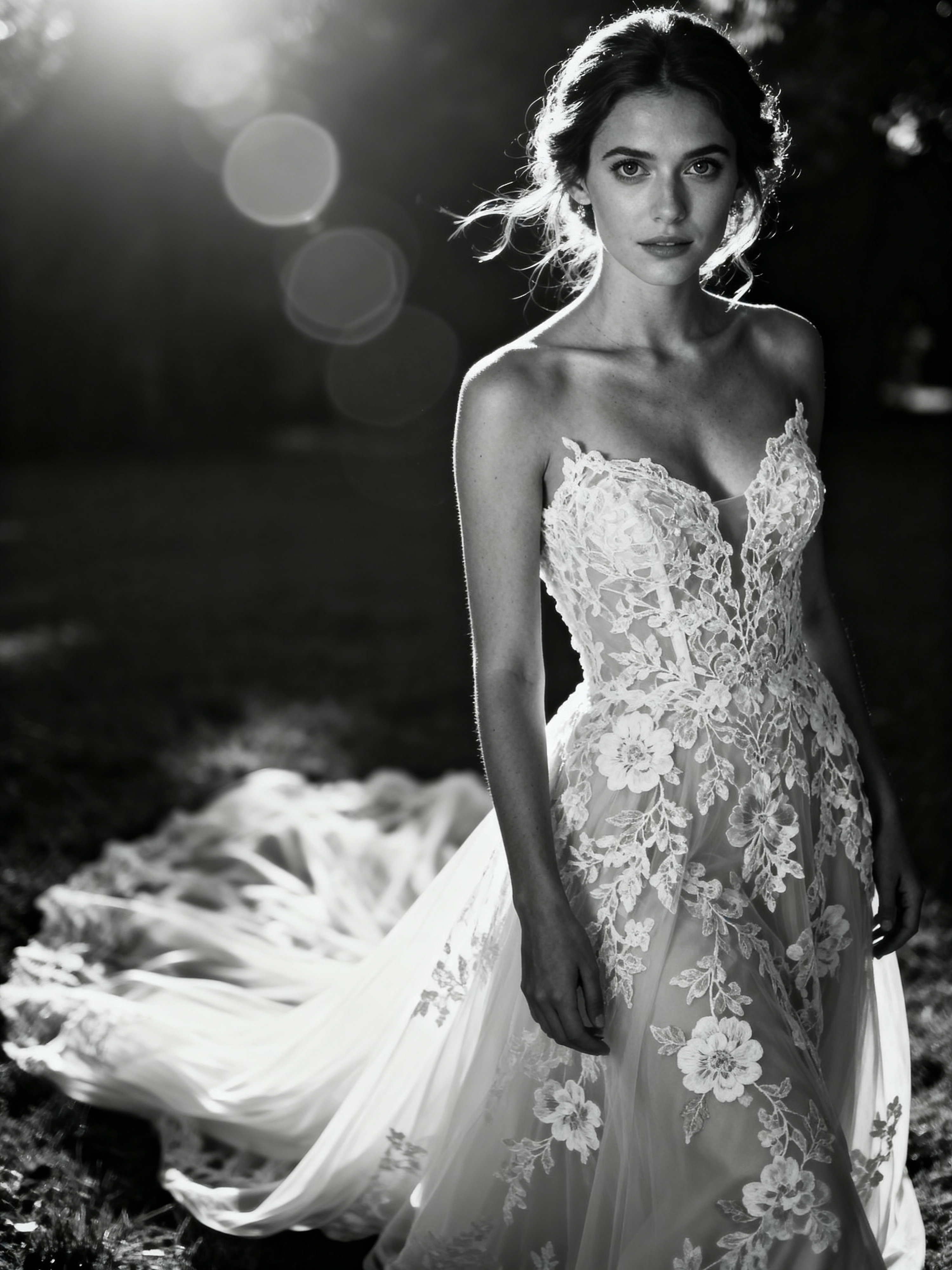 black and white Artistic wedding portrait, capturing emotions of the special day. Model wearing a vintage-inspired lace wedding dress . Timeless and graceful composition.