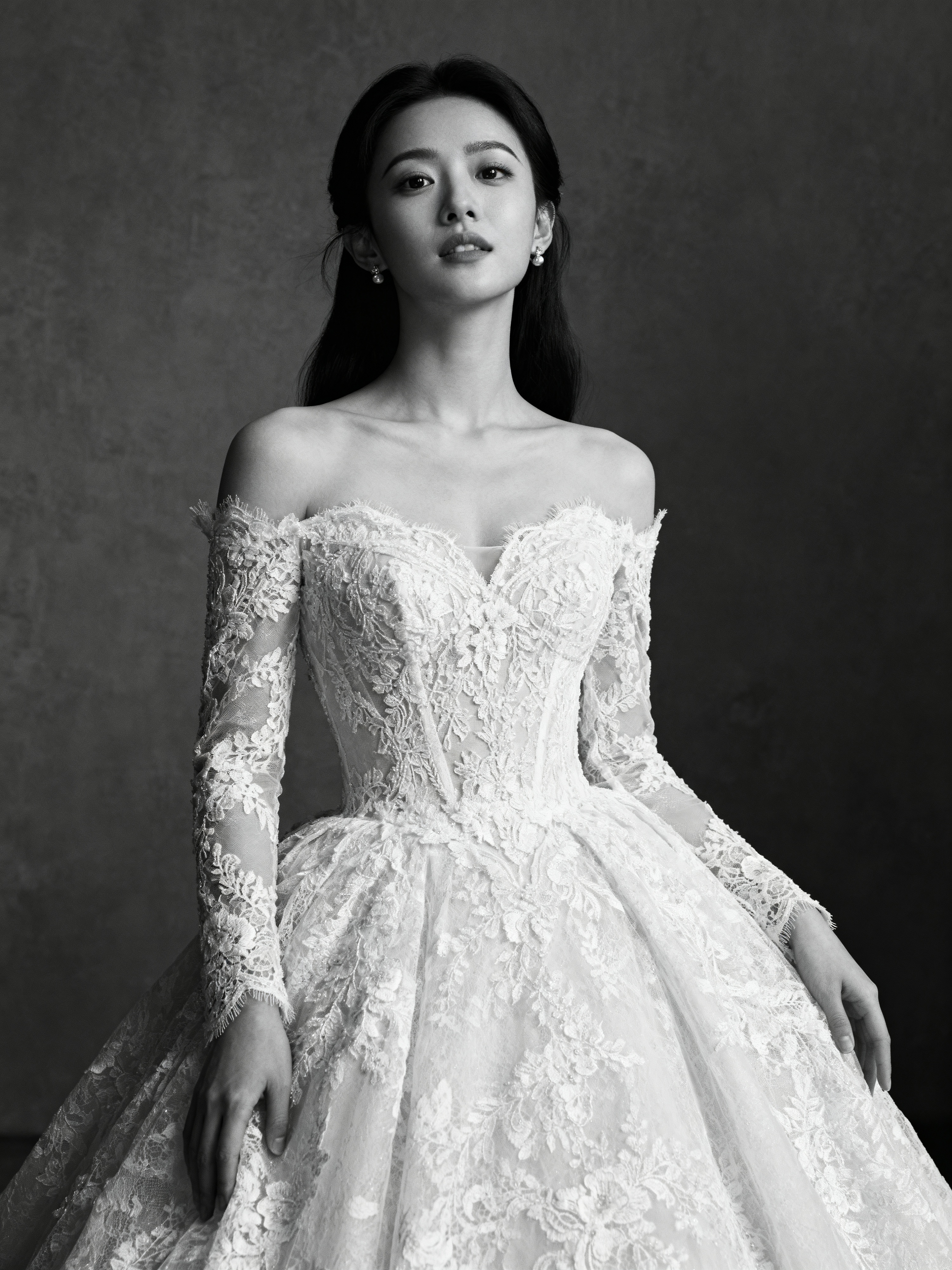 black and white Artistic wedding portrait, capturing emotions of the special day. Model wearing a vintage-inspired lace wedding dress . Timeless and graceful composition.