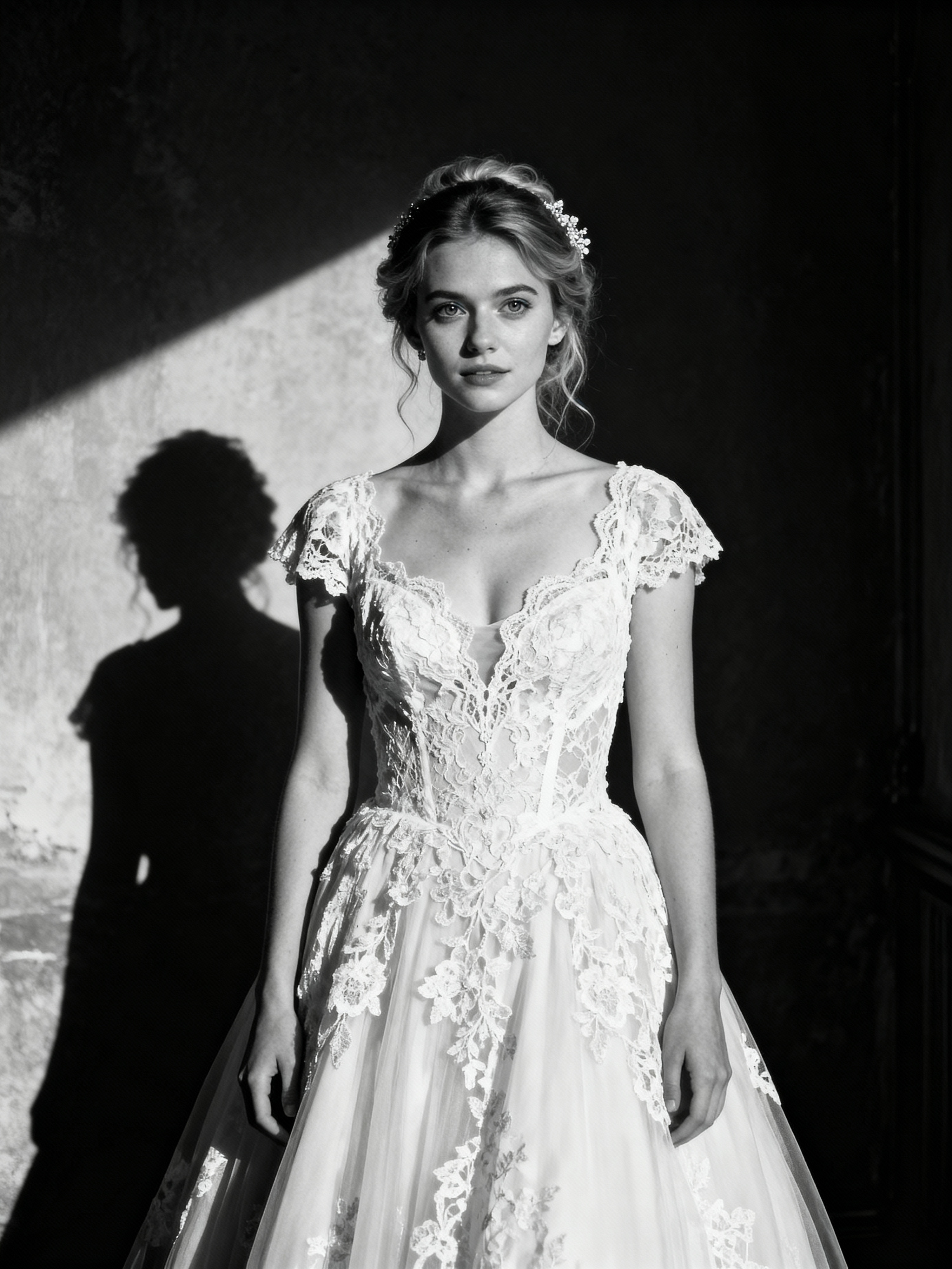 black and white Artistic wedding portrait, capturing emotions of the special day. Model wearing a vintage-inspired lace wedding dress . Timeless and graceful composition.