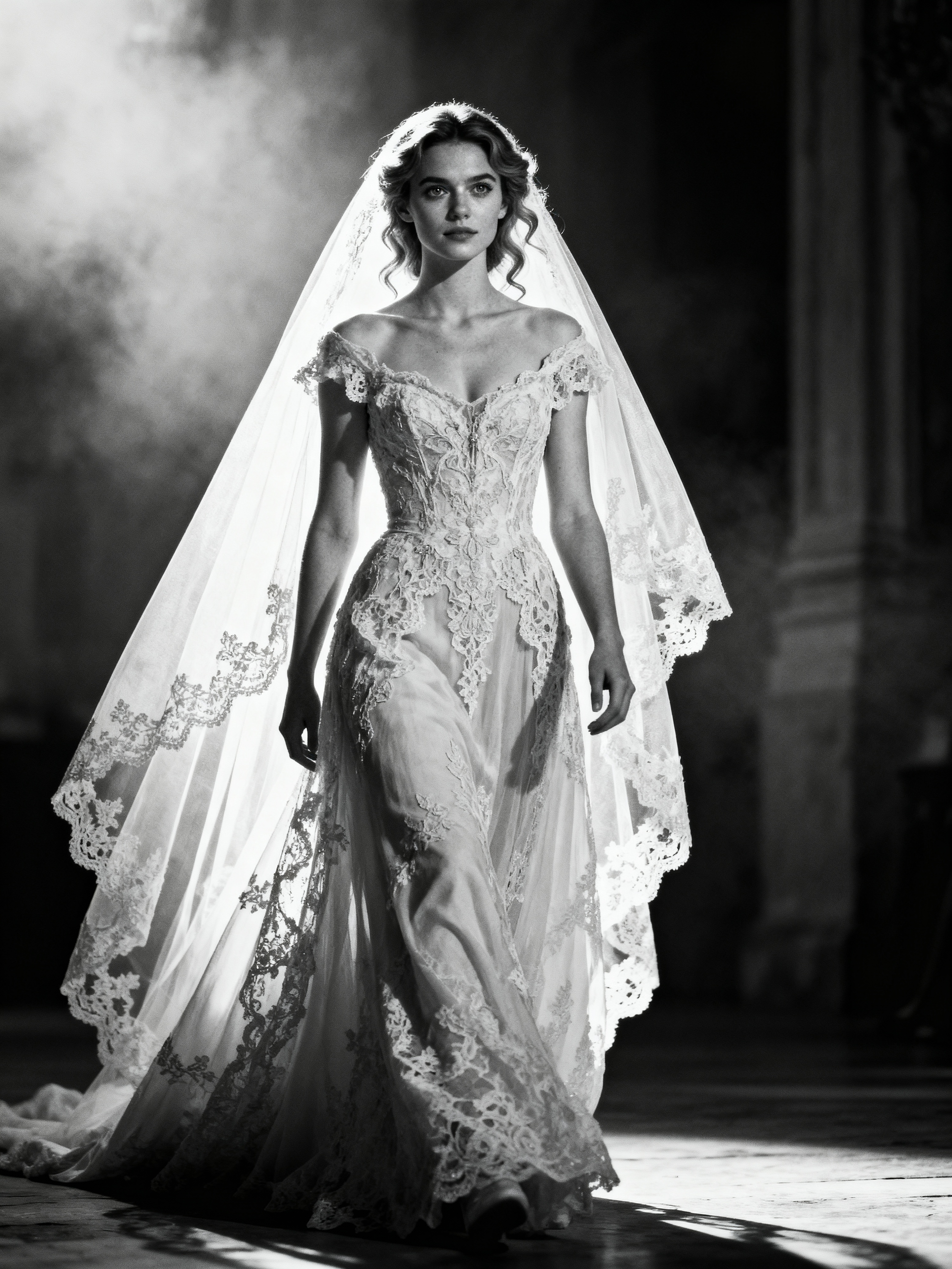 black and white Artistic wedding portrait, capturing emotions of the special day. Model wearing a vintage-inspired lace wedding dress . Timeless and graceful composition.