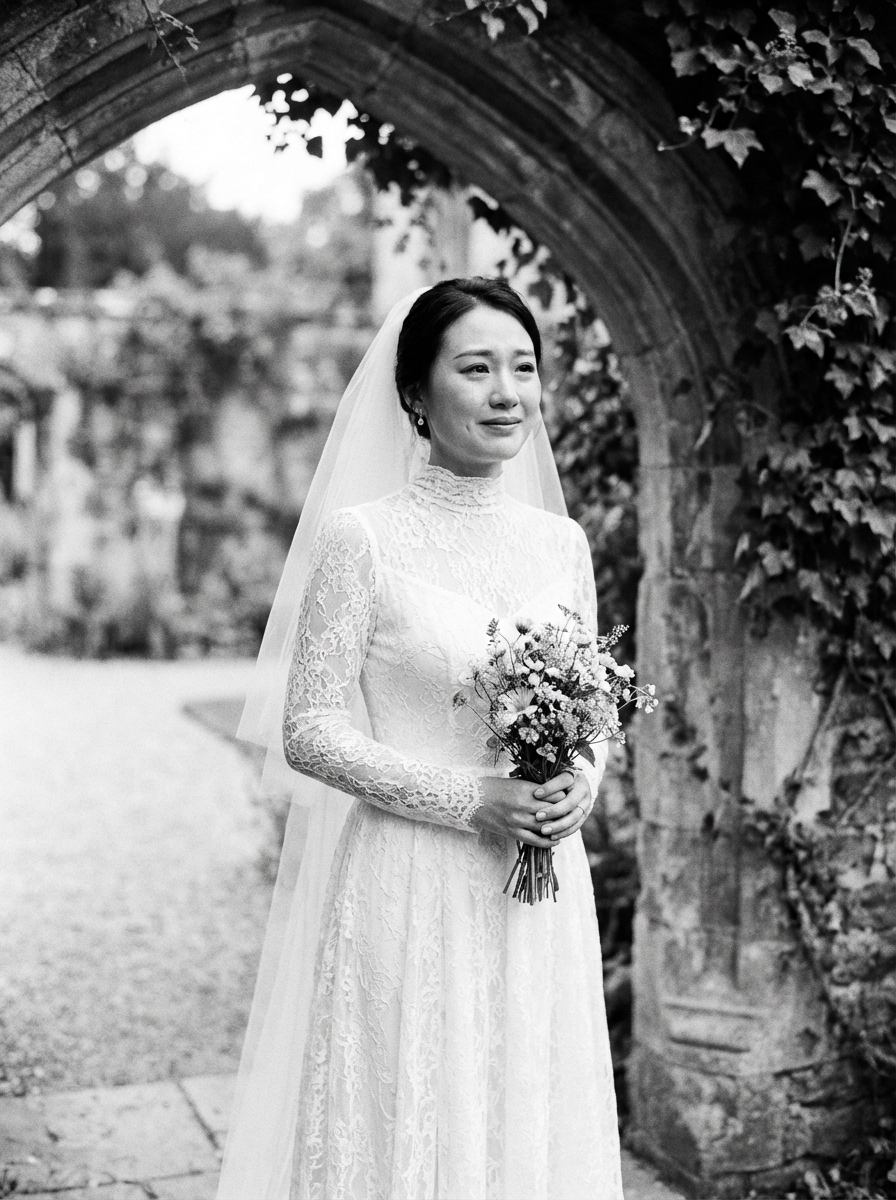 black and white Artistic wedding portrait, capturing emotions of the special day. Model wearing a vintage-inspired lace wedding dress . Timeless and graceful composition.