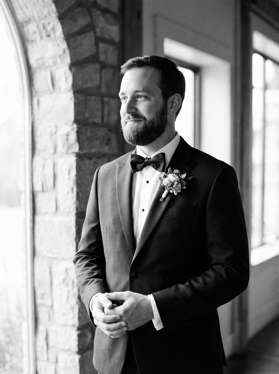 black and white Artistic wedding portrait, capturing emotions of the special day. Model wearing a monochrome wedding tuxedo with boutonnière . Timeless and graceful composition.