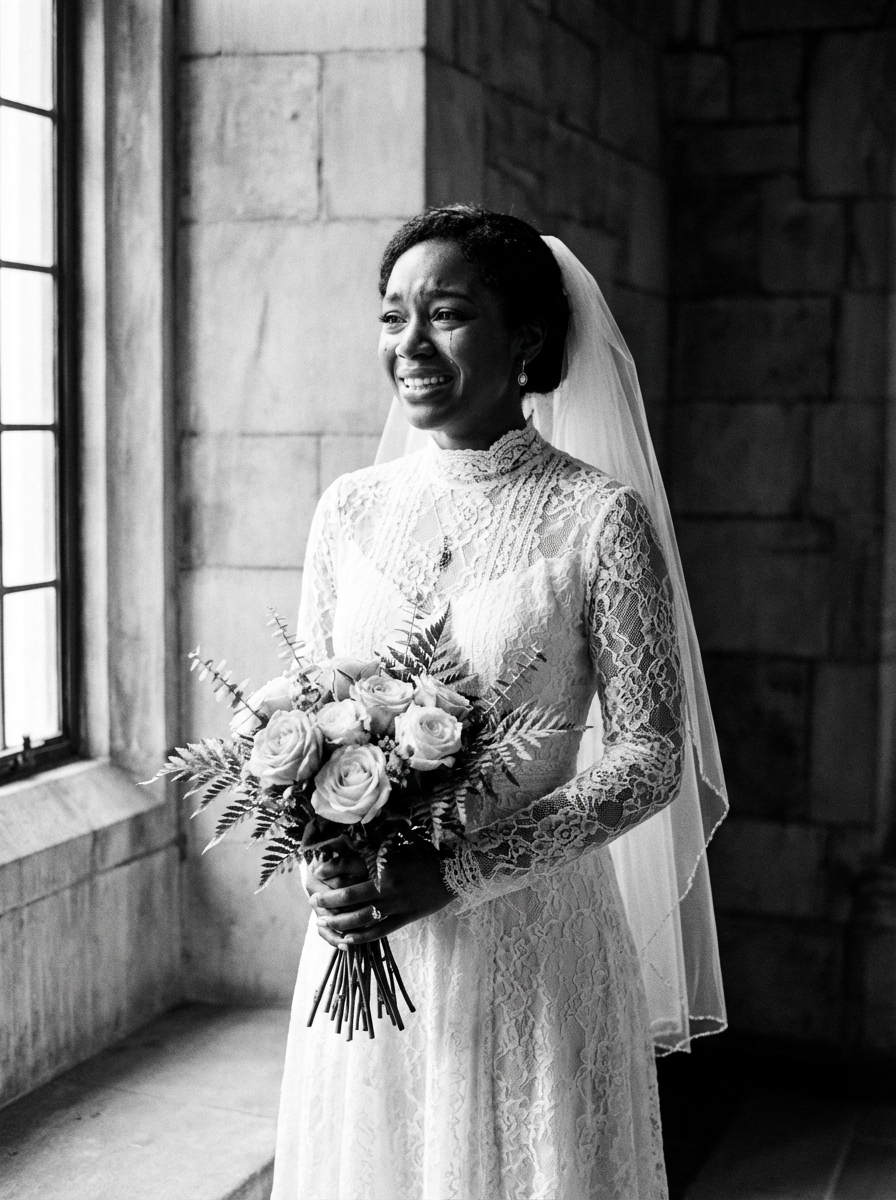 black and white Artistic wedding portrait, capturing emotions of the special day. Model wearing a vintage-inspired lace wedding dress . Timeless and graceful composition.