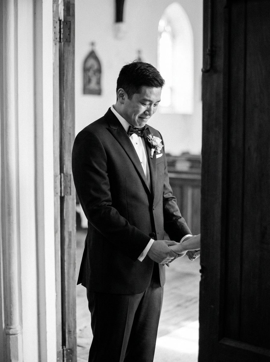 black and white Artistic wedding portrait, capturing emotions of the special day. Model wearing a monochrome wedding tuxedo with boutonnière . Timeless and graceful composition.