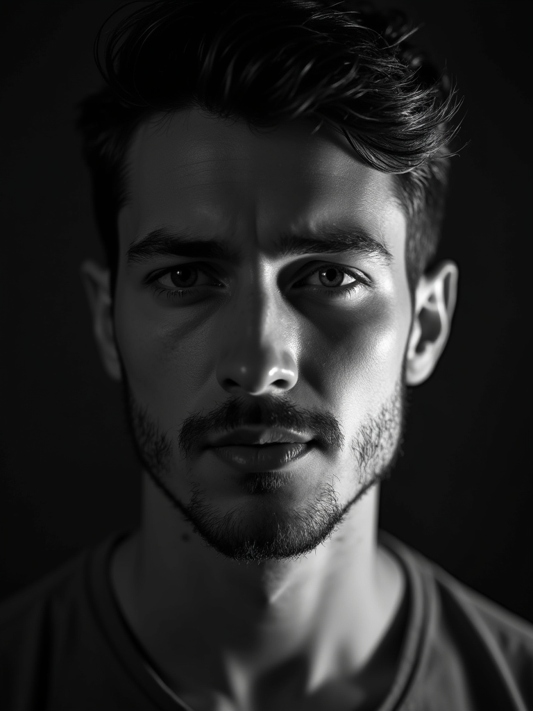 Black and white close-up portrait of model with creative lighting. Strong features, dramatic shadows. High contrast black and white photography.