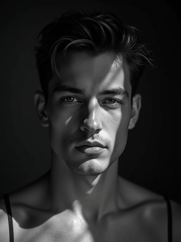 Black and white close-up portrait of model with creative lighting. Strong features, dramatic shadows. High contrast black and white photography.