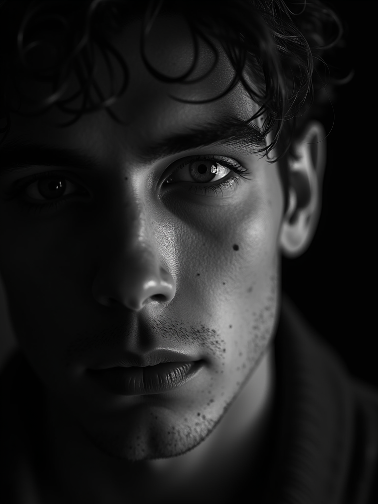 Black and white close-up portrait of model with creative lighting. Strong features, dramatic shadows. High contrast black and white photography.