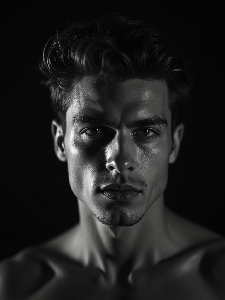 Black and white close-up portrait of model with dramatic shadows. Strong jawline emphasized by contrast. High contrast lighting, artistic composition.