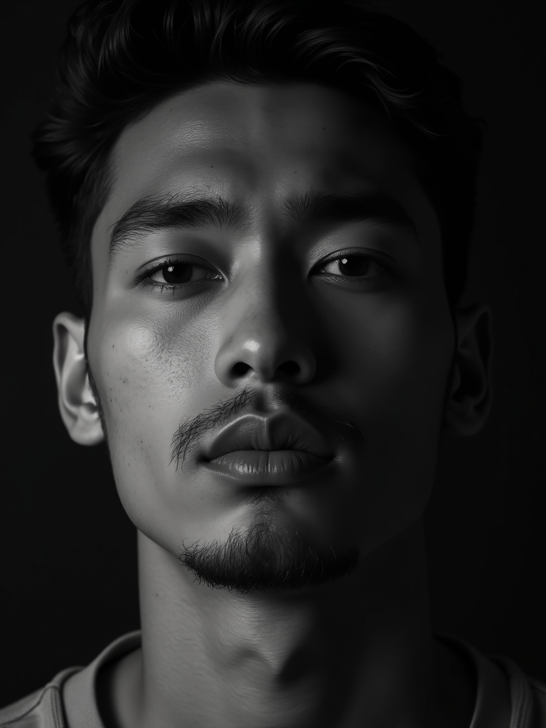 Black and white close-up portrait of model with dramatic shadows. Strong jawline emphasized by contrast. High contrast lighting, artistic composition.