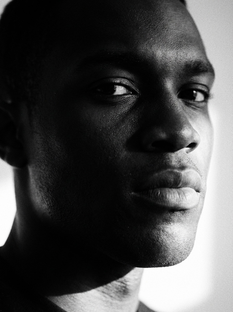 Black and white close-up portrait of model with dramatic shadows. Strong jawline emphasized by contrast. High contrast lighting, artistic composition.
