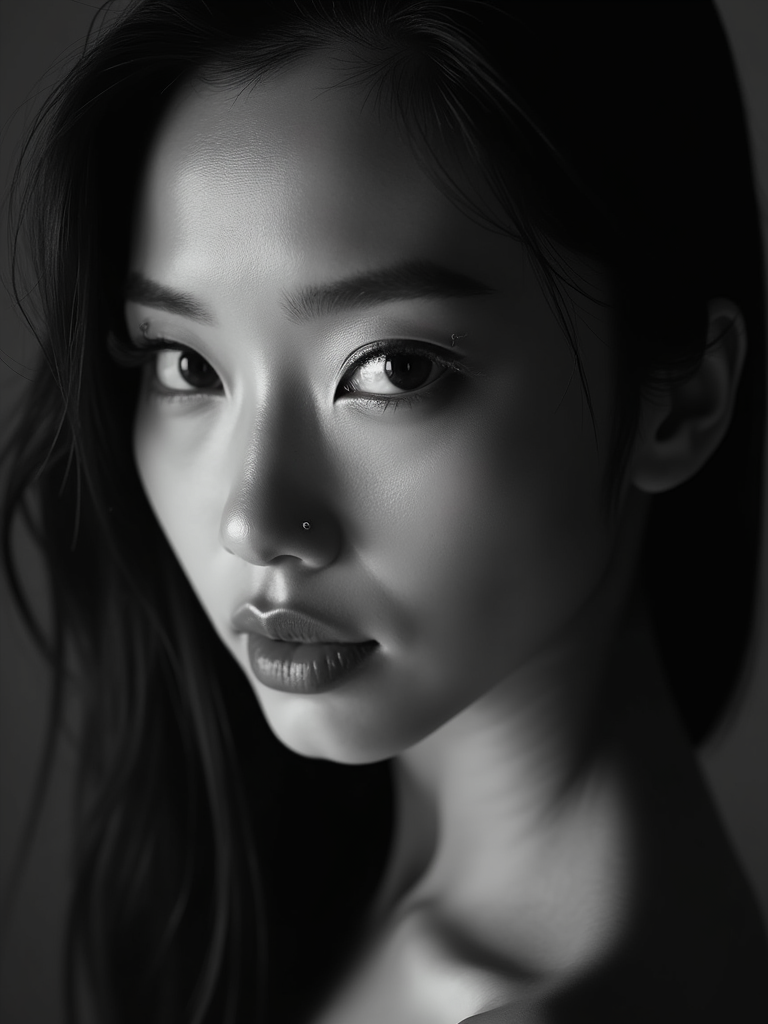 Black and white close-up portrait of model with creative lighting. Sensual features, dramatic makeup . High contrast black and white photography.