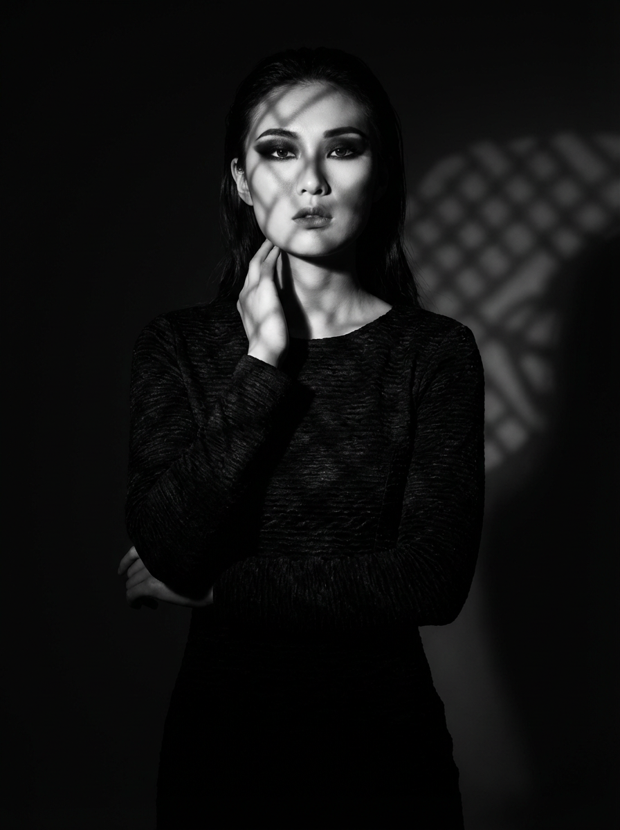 Black and white close-up portrait of model with creative lighting. Sensual features, dramatic makeup . High contrast black and white photography.