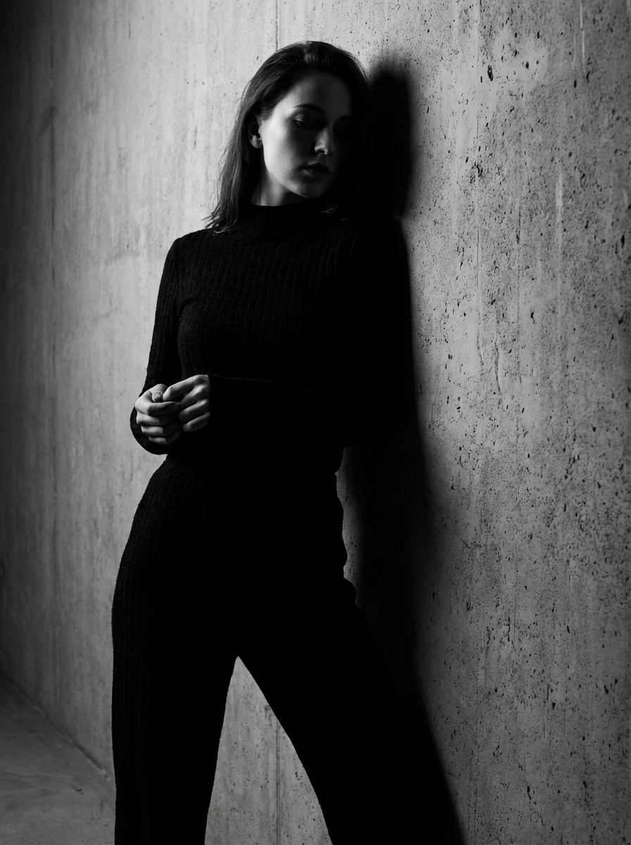 Black and white close-up portrait of model with dramatic shadows. Sensual features enhanced by shadow play . High contrast lighting, artistic composition.