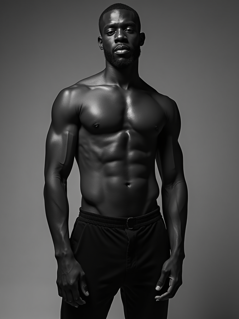 Black and white full body portrait of model. Bold stance, striking composition. Artistic monochrome photography.