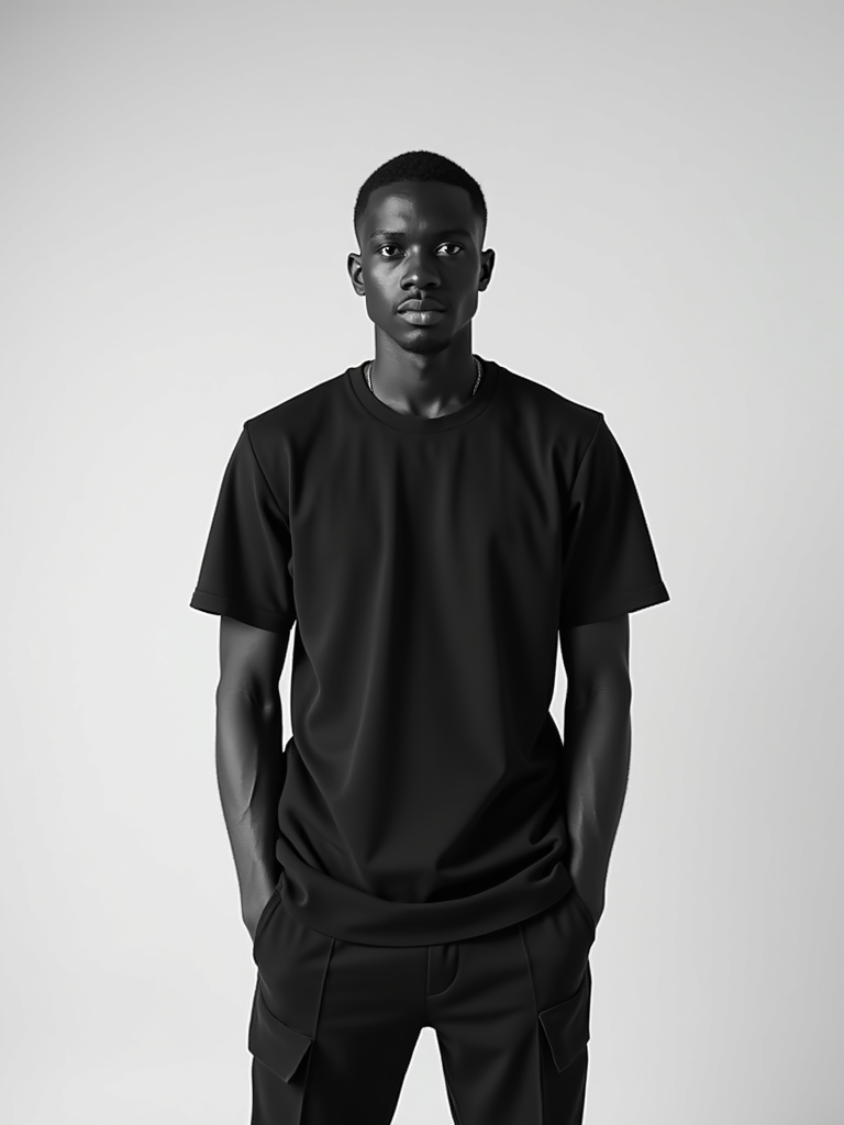 Black and white full body portrait of model. Bold stance, striking composition. Artistic monochrome photography.