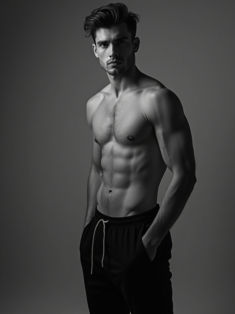 Black and white full body portrait of model. Bold stance, striking composition. Artistic monochrome photography.