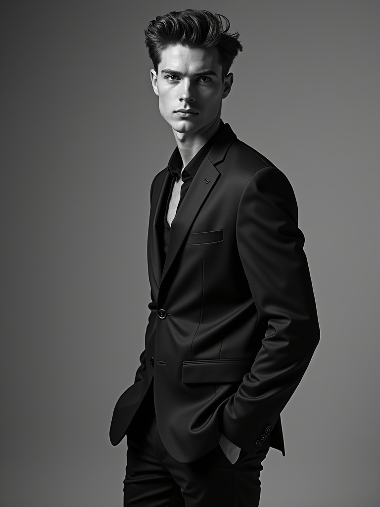 Black and white full body portrait of model. Bold stance, striking composition. Artistic monochrome photography.