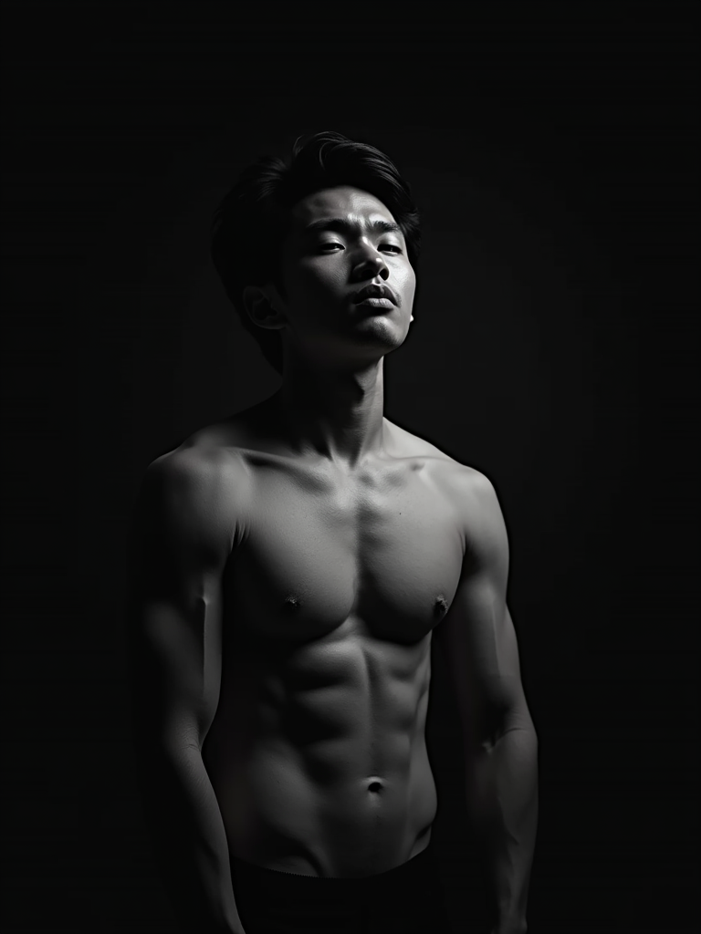 Black and white full body portrait of model with dramatic lighting. Full body in high contrast. Artistic lighting composition.