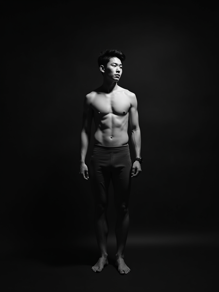 Black and white full body portrait of model with dramatic lighting. Full body in high contrast. Artistic lighting composition.