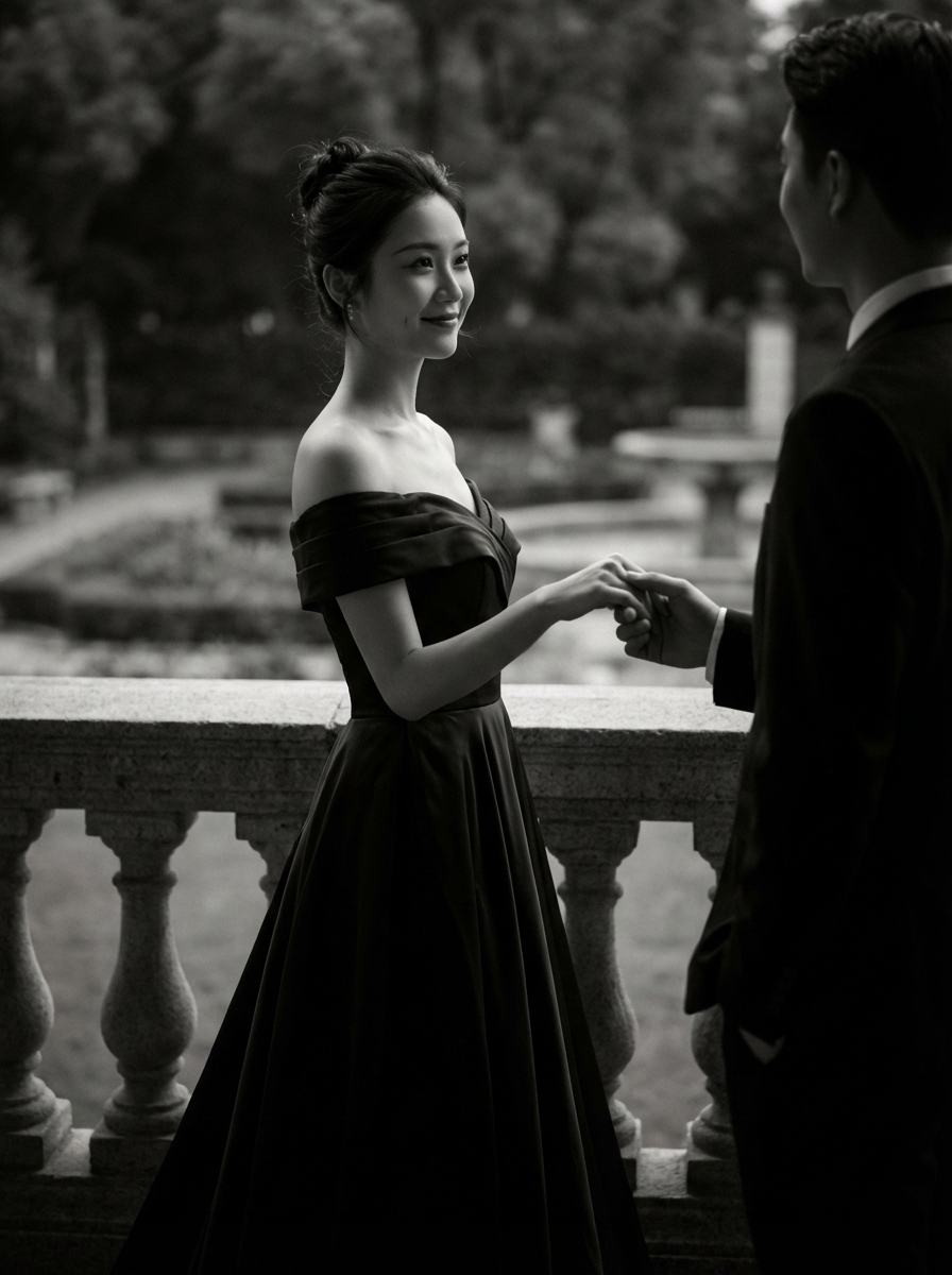 black and white Romantic engagement portrait. Model wearing an elegant off-shoulder dress . Timeless and cinematic.