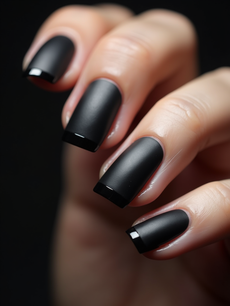black matte nails with glossy tips, dramatic close-up with contrast lighting, edgy modern styling, professional manicure display