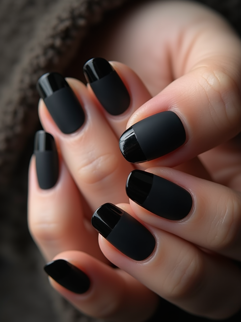 black matte nails with glossy tips, dramatic close-up with contrast lighting, edgy modern styling, professional manicure display