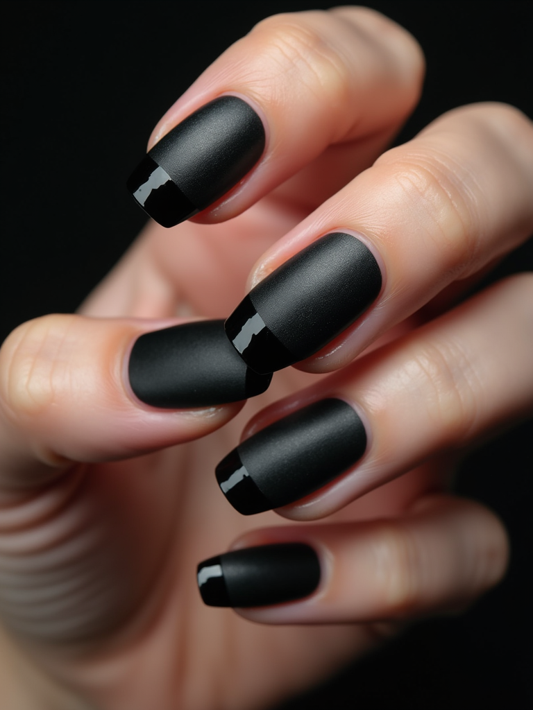 black matte nails with glossy tips, dramatic close-up with contrast lighting, edgy modern styling, professional manicure display